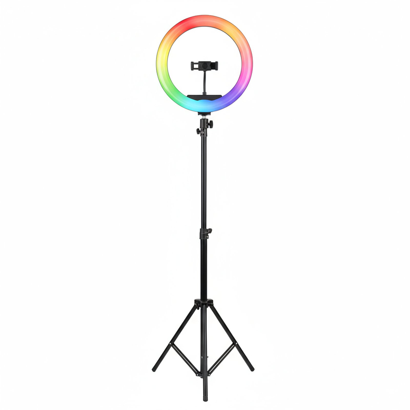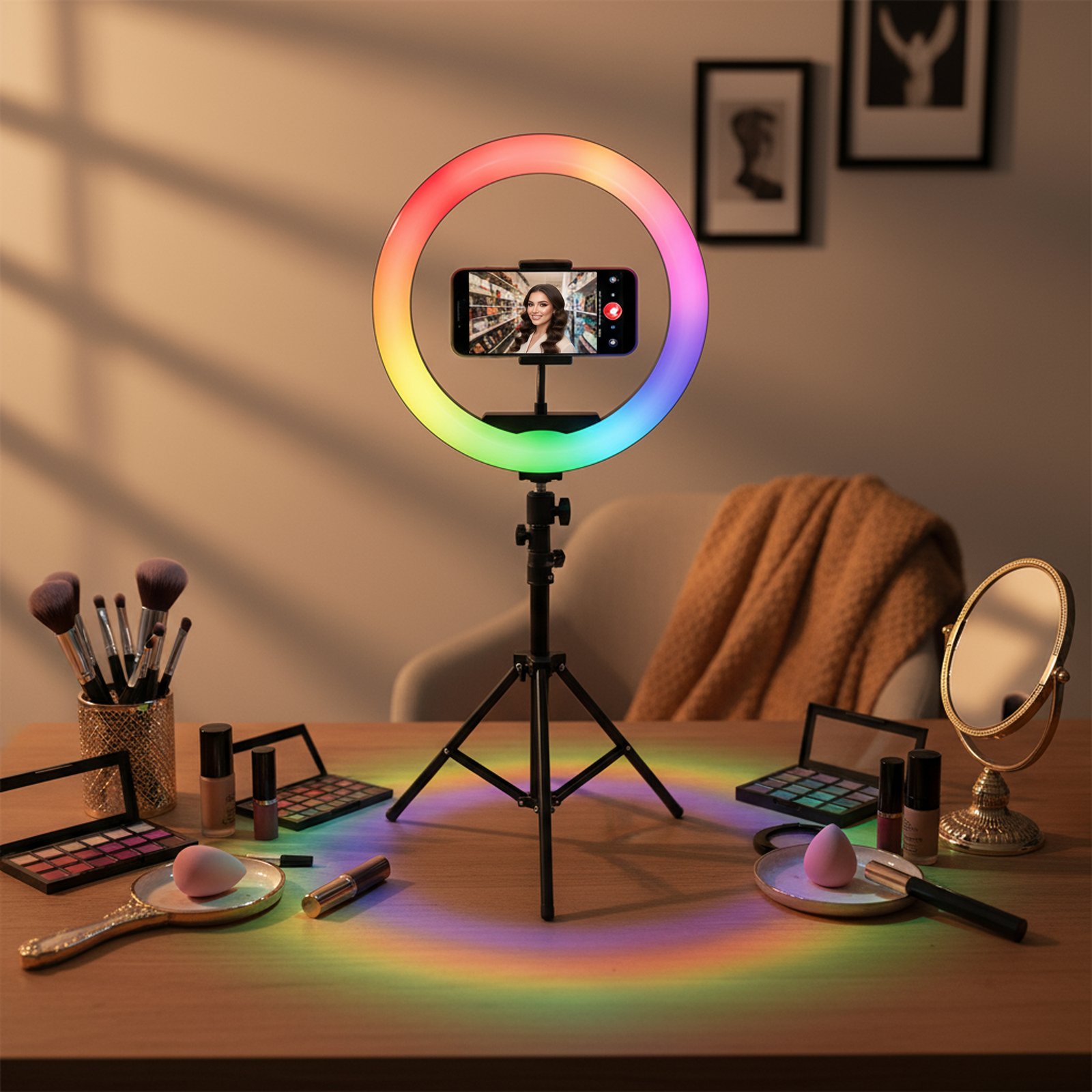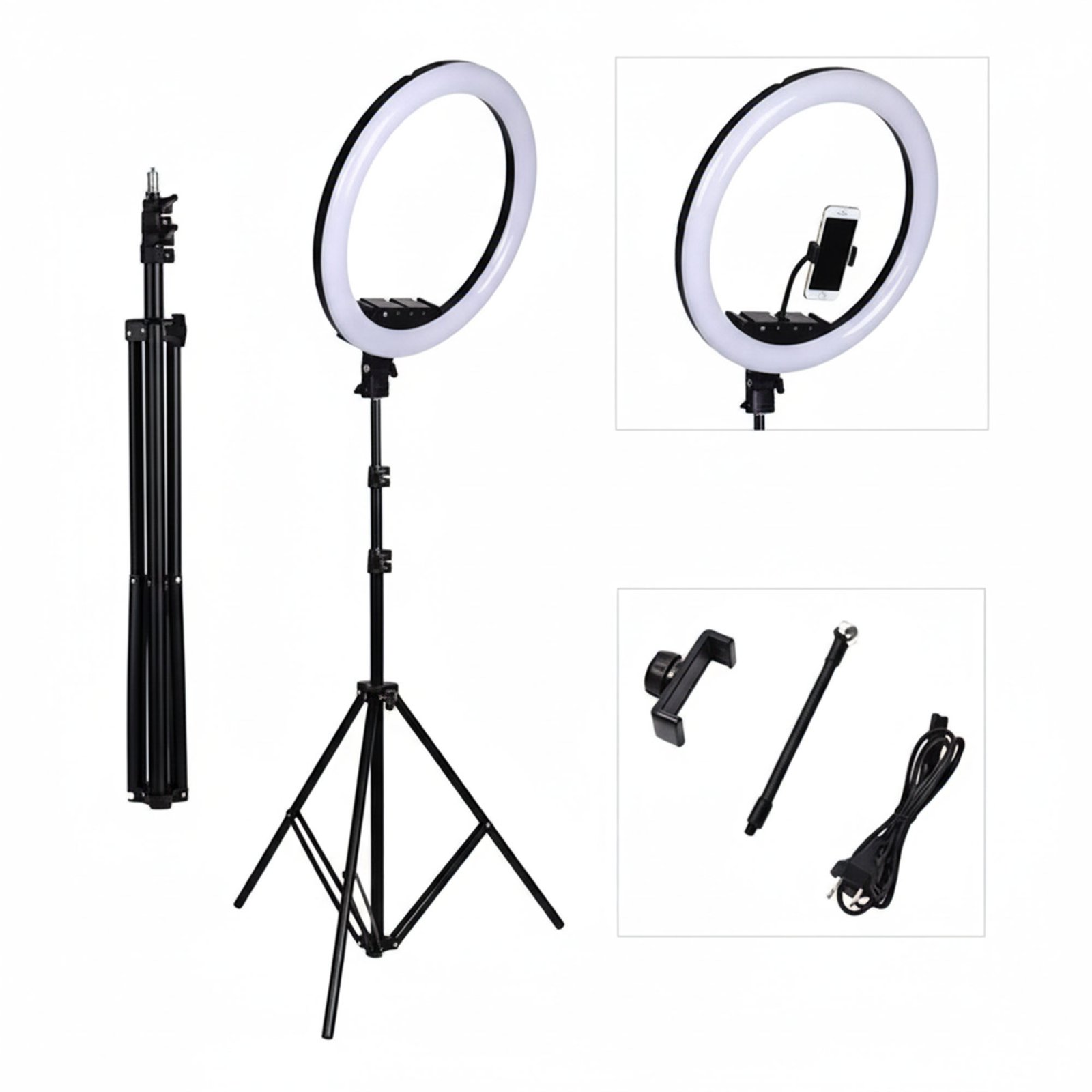 رينج لايت للتصوير دائرية مع حامل معدني متين يضمن ثبات الإضاءة وجودة الصور والفيديو. توفر درجات سطوع قابلة للتعديل لتصوير احترافي في أي مكان مع ضمان عامين، مثالية للبث المباشر، تصوير المحتوى، والفيديوهات الشخصية بجودة عالية ومظهر جذاب.