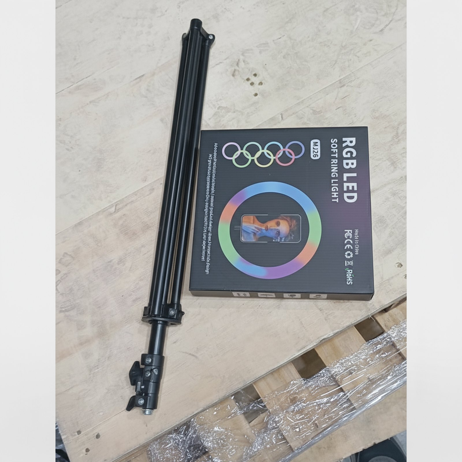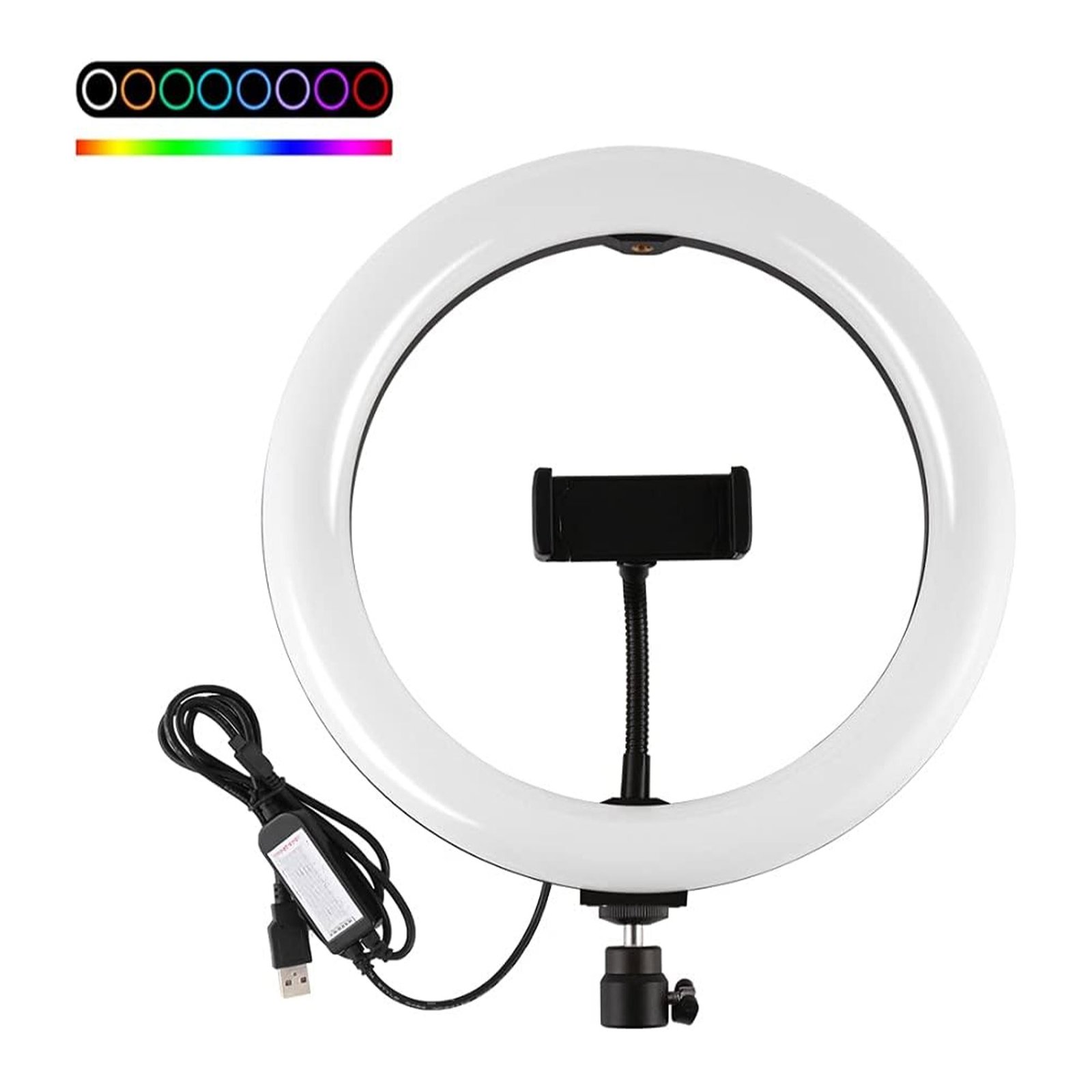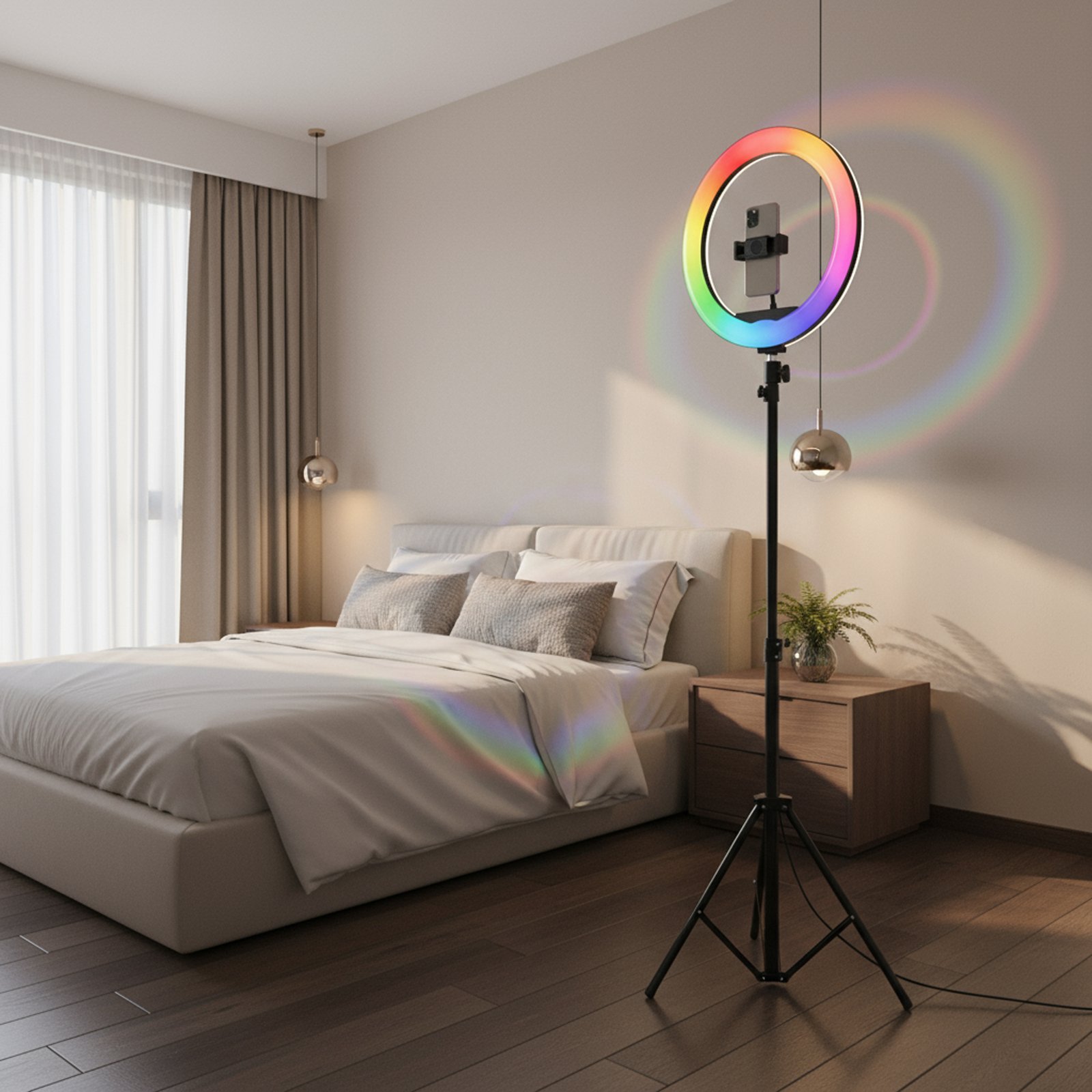 رينج لايت للتصوير دائرية مع حامل معدني متين يضمن ثبات الإضاءة وجودة الصور والفيديو. توفر درجات سطوع قابلة للتعديل لتصوير احترافي في أي مكان مع ضمان عامين، مثالية للبث المباشر، تصوير المحتوى، والفيديوهات الشخصية بجودة عالية ومظهر جذاب.